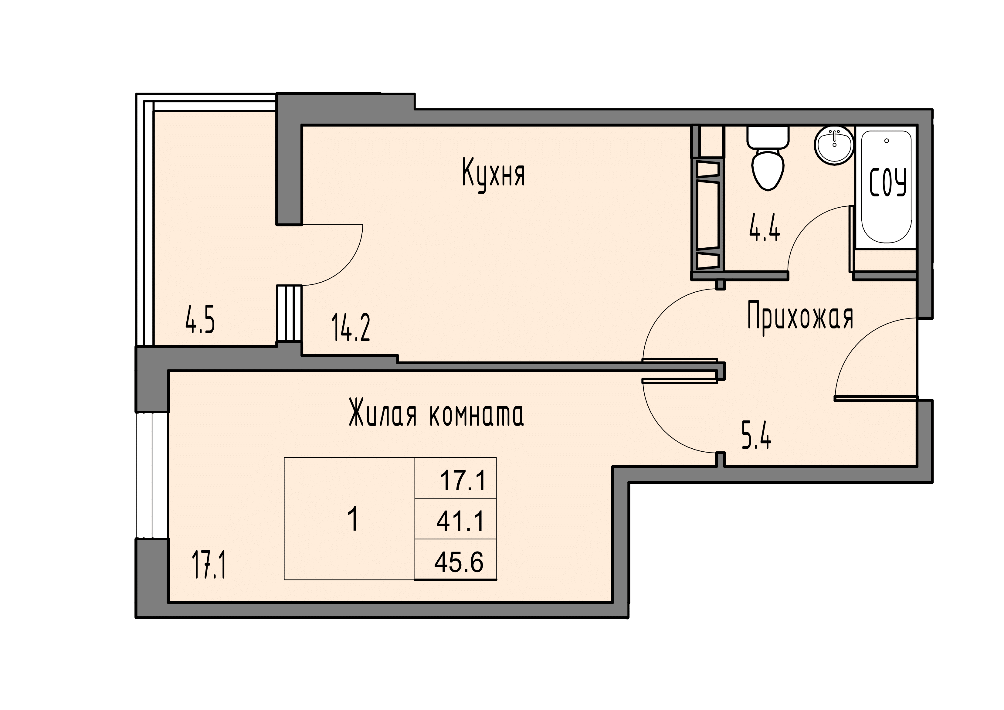Общая площадь: 42.80м2