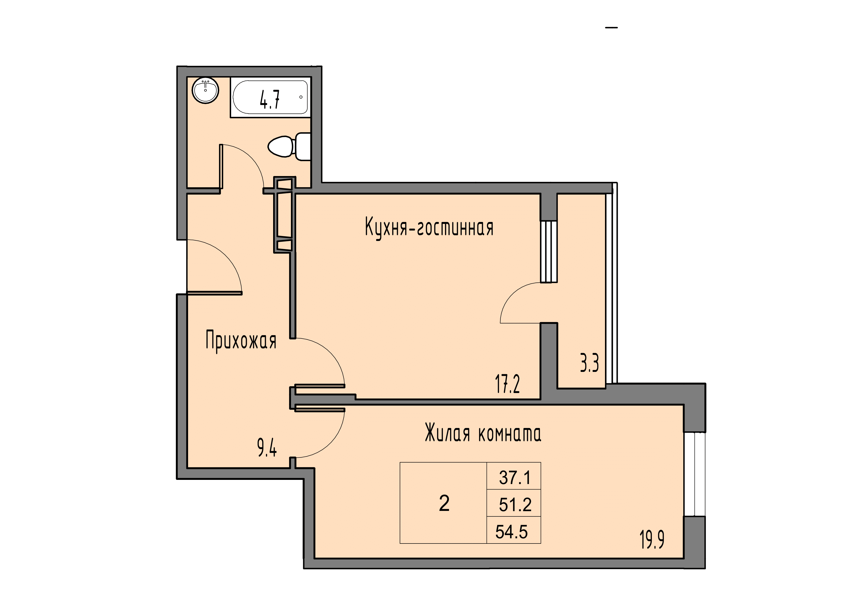 Общая площадь: 52.80м2