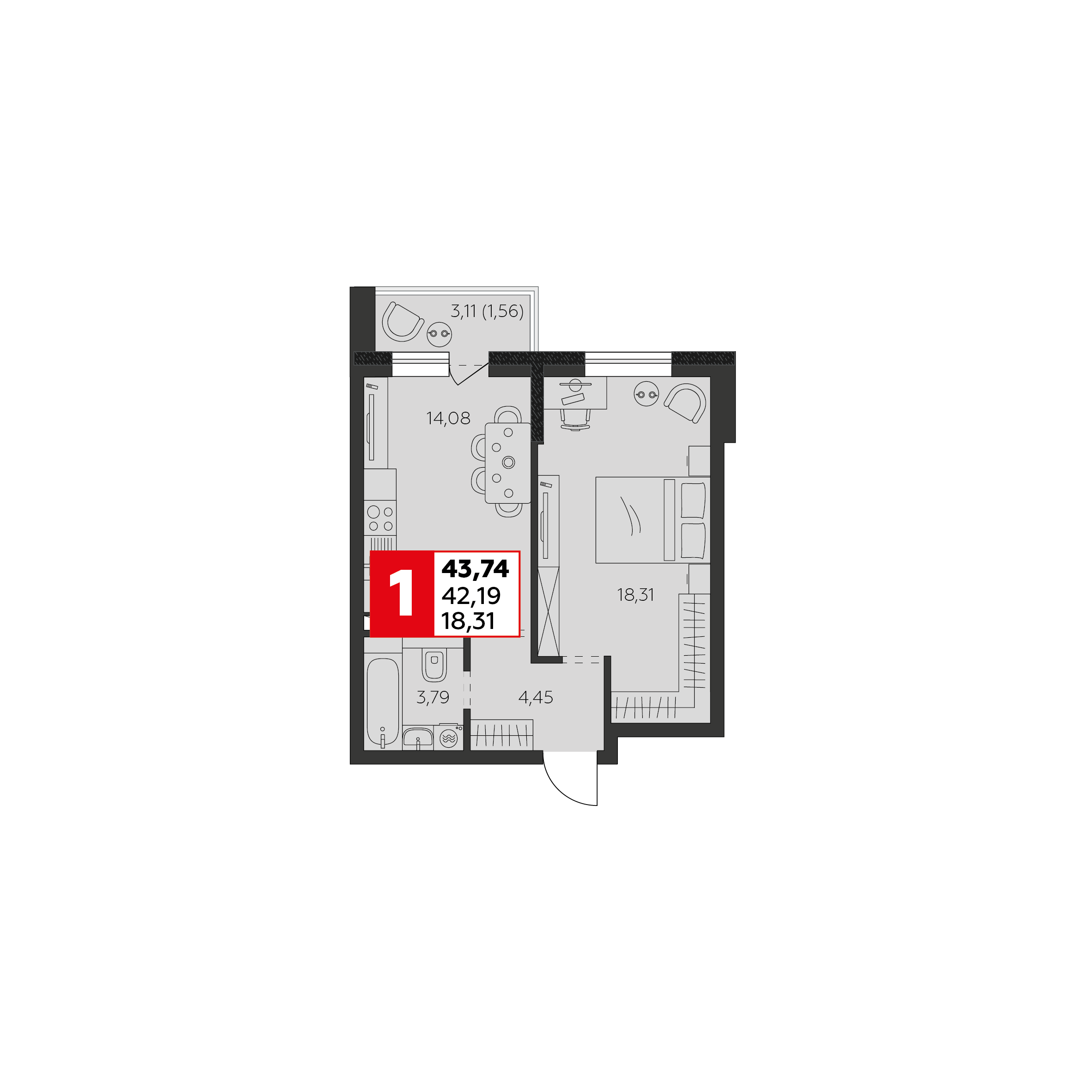 Общая площадь: 42.19м2