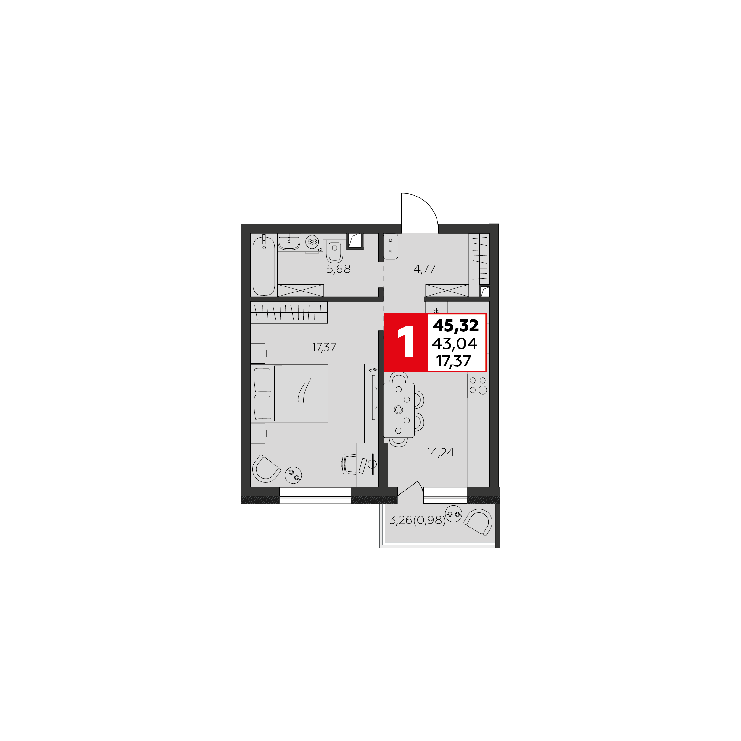 Общая площадь: 43.04м2