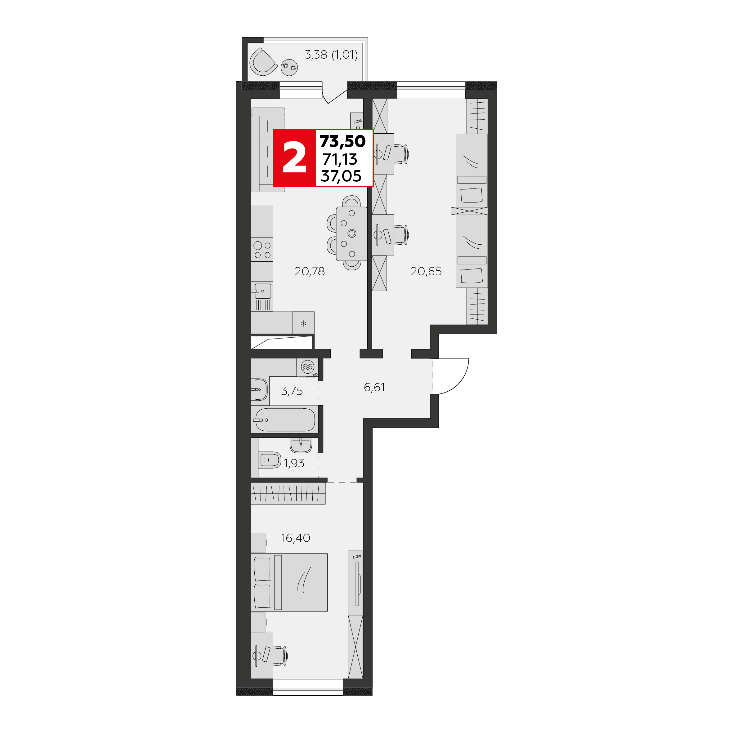 Общая площадь: 71.13м2
