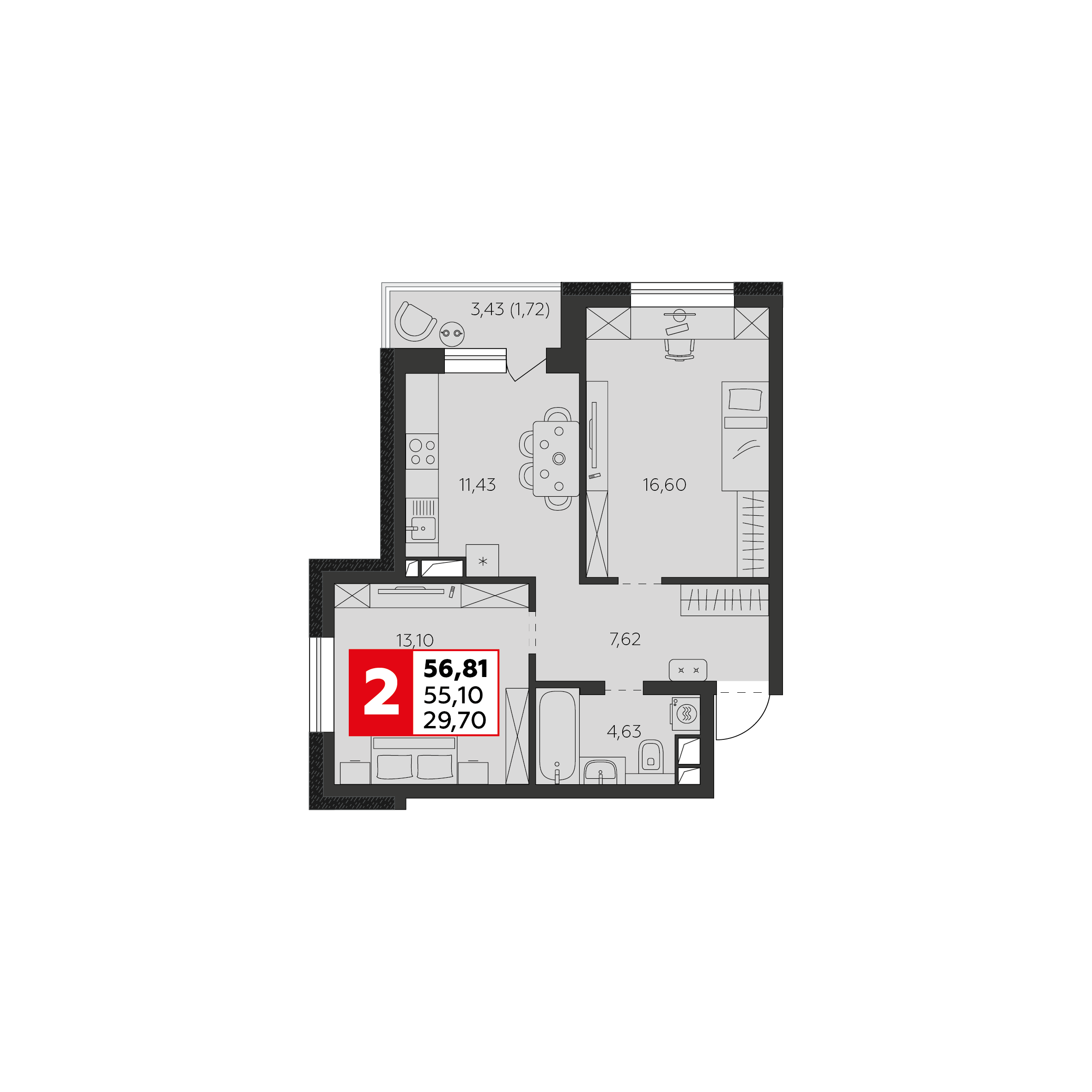 Общая площадь: 55.10м2