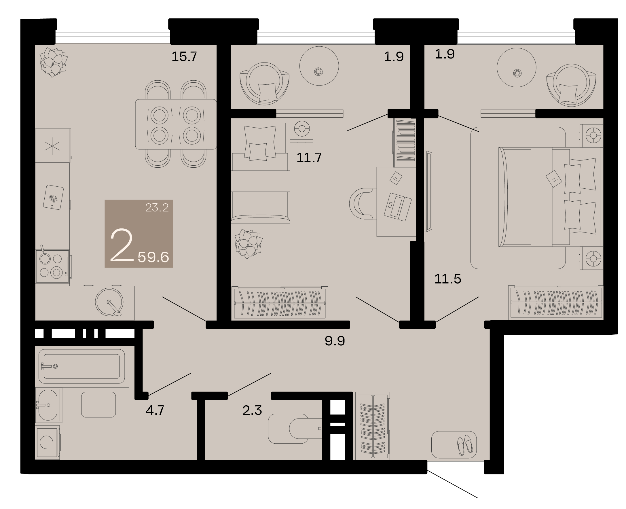 Квартира этаж 10, площадь 59.60 м2