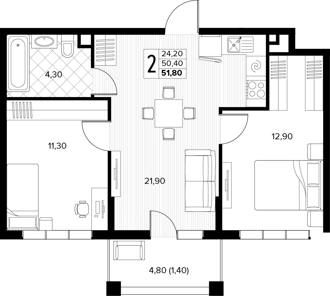 Общая площадь: 51.80м2