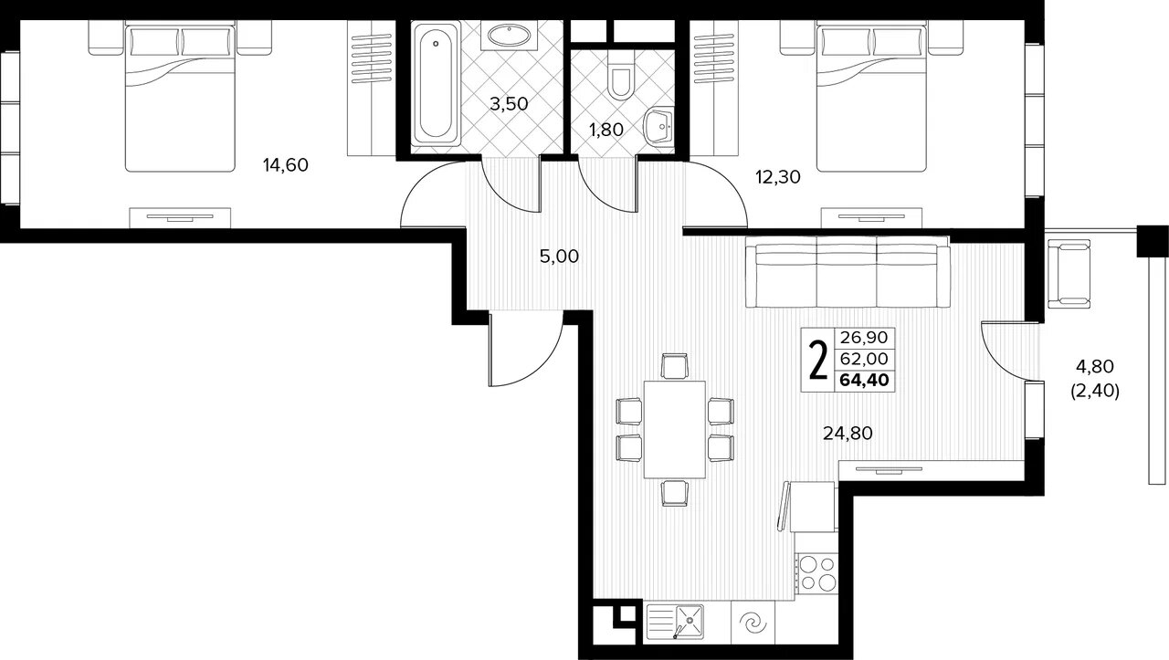 Квартира этаж 2, площадь 64.40 м2