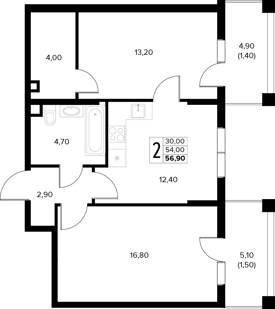 Общая площадь: 56.90м2
