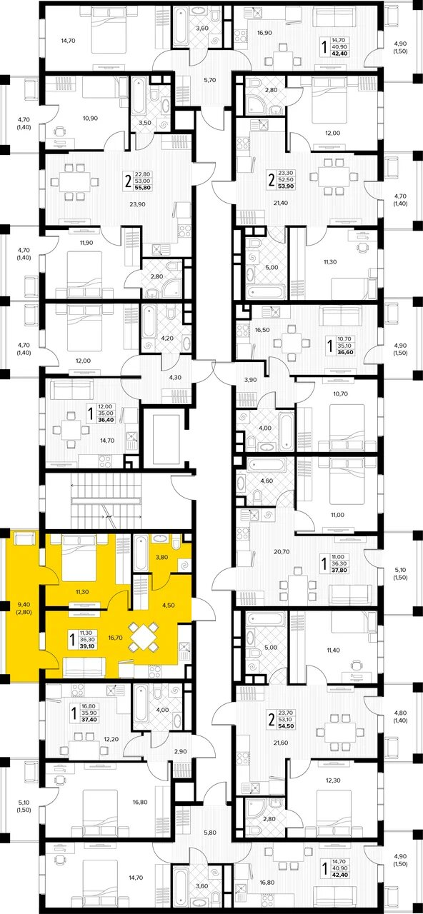 Квартира этаж 2, площадь 39.10 м2