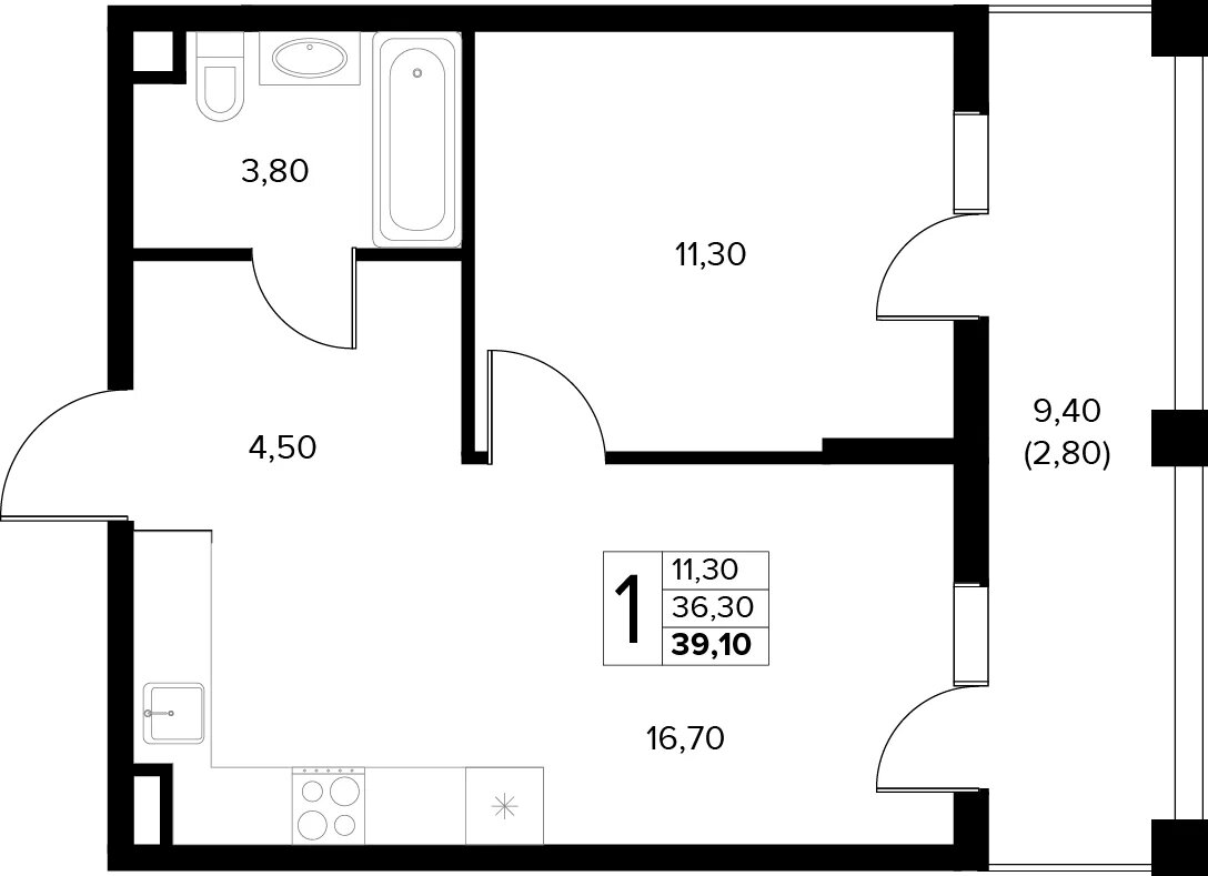 Общая площадь: 39.10м2