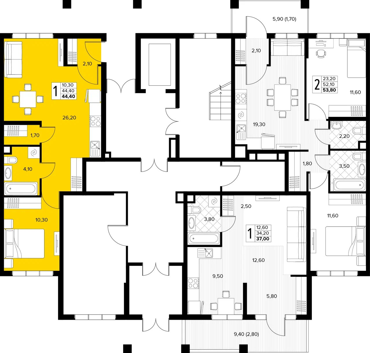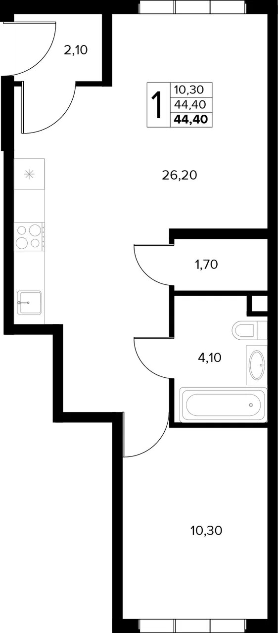 Квартира этаж 1, площадь 44.40 м2
