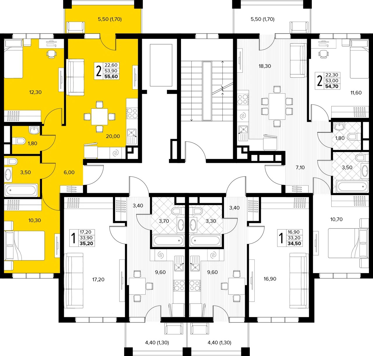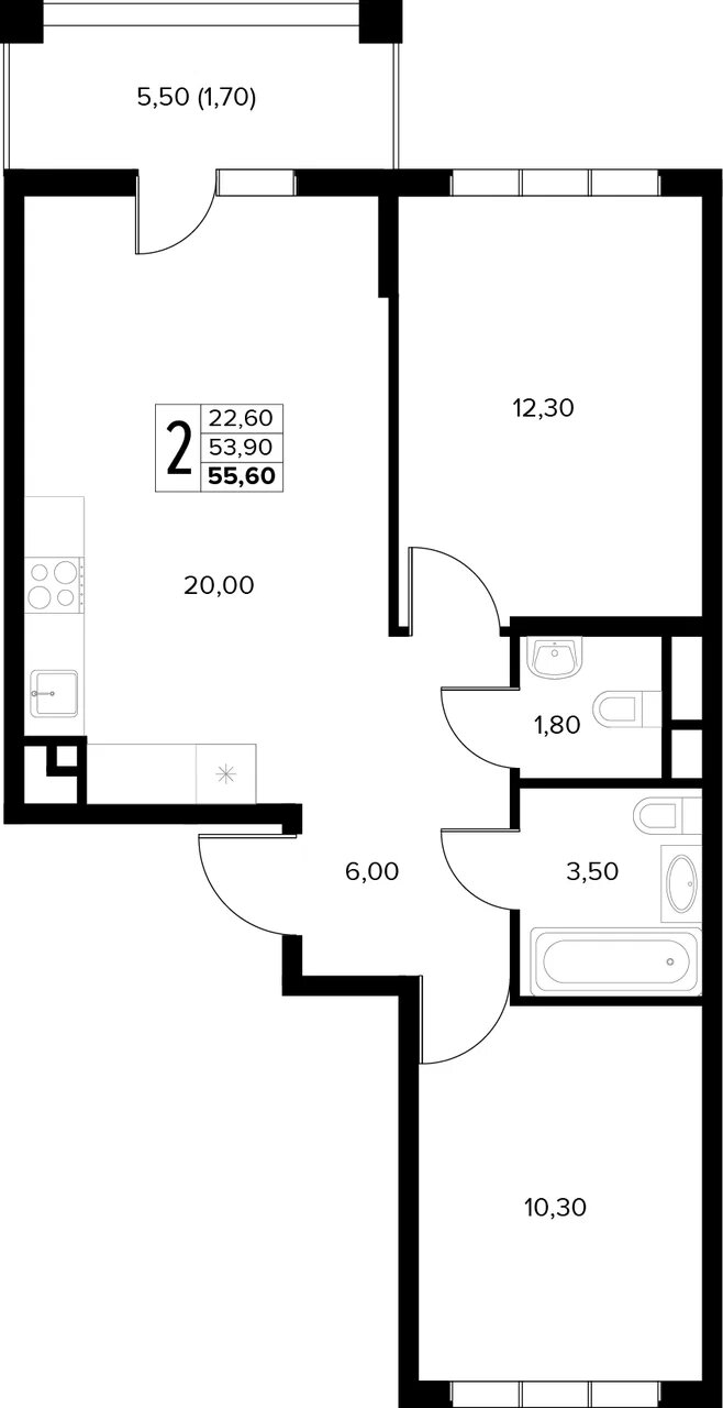 Общая площадь: 55.60м2