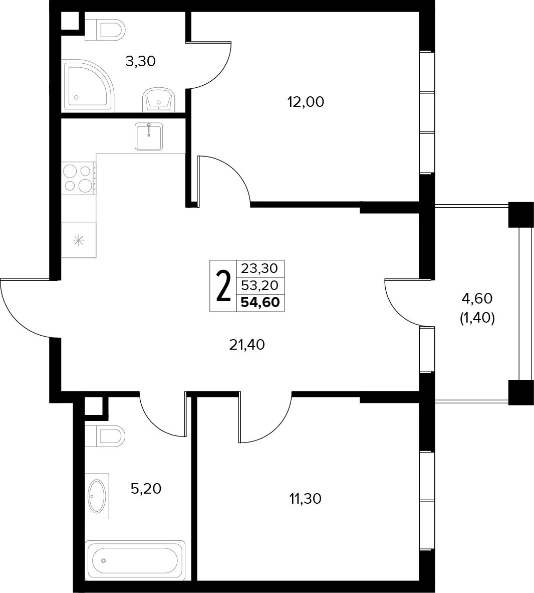 Общая площадь: 54.60м2