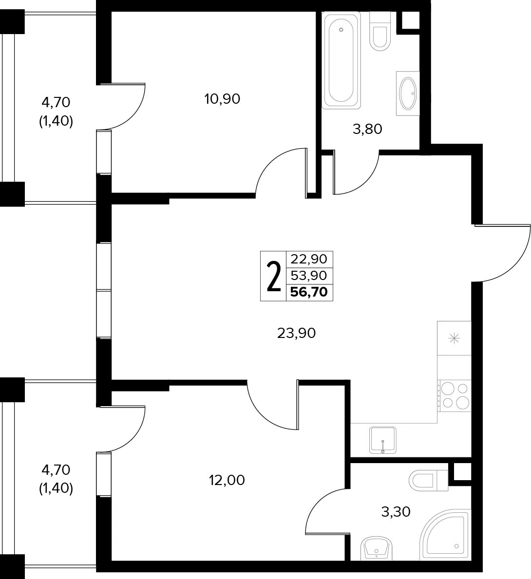 Общая площадь: 56.70м2