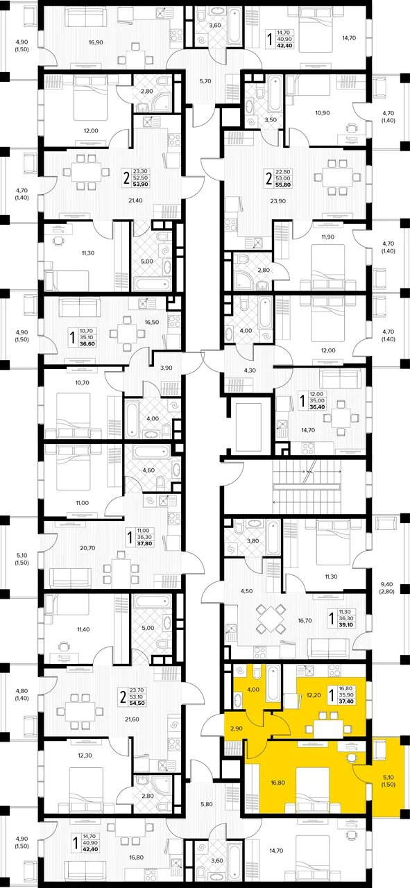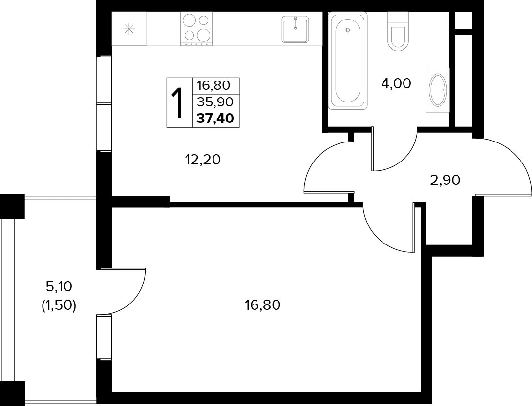 Квартира этаж 6, площадь 37.40 м2