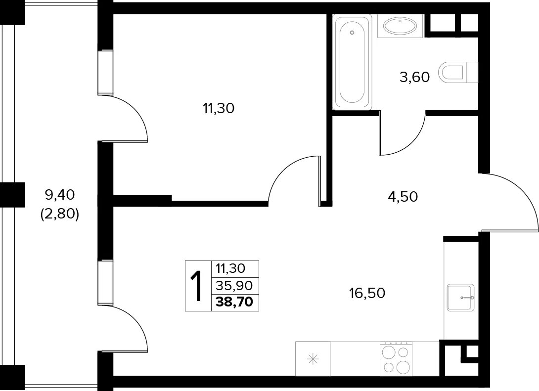 Общая площадь: 38.70м2