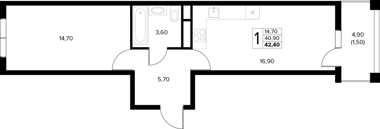 Квартира этаж 7, площадь 42.40 м2