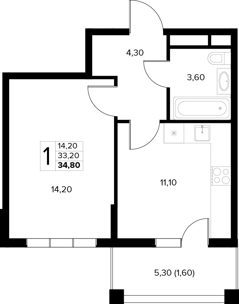Общая площадь: 34.80м2