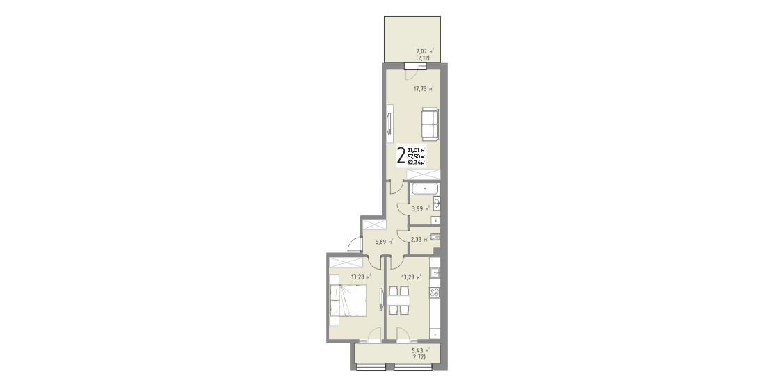 Общая площадь: 62.34м2
