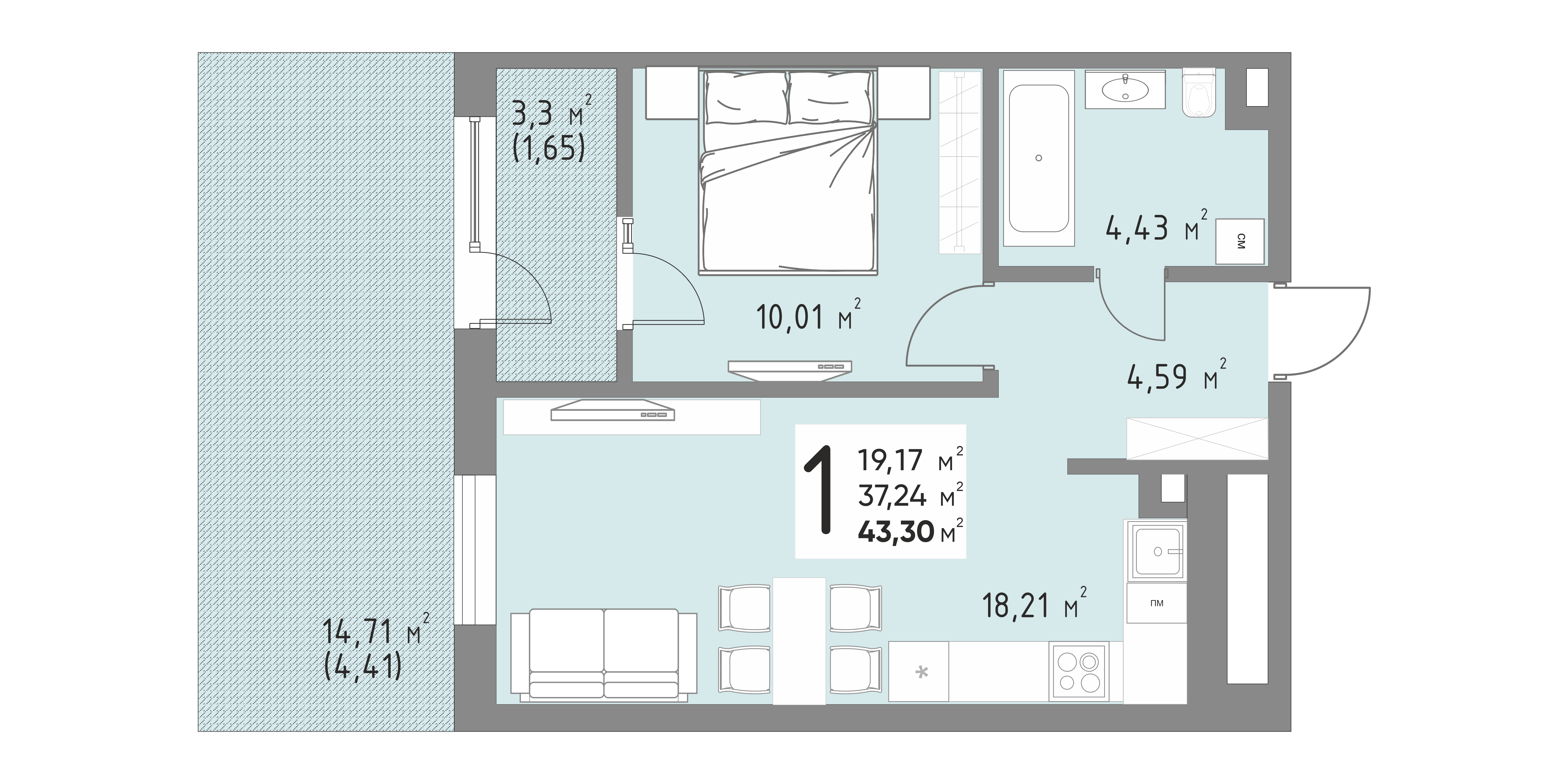Общая площадь: 43.30м2