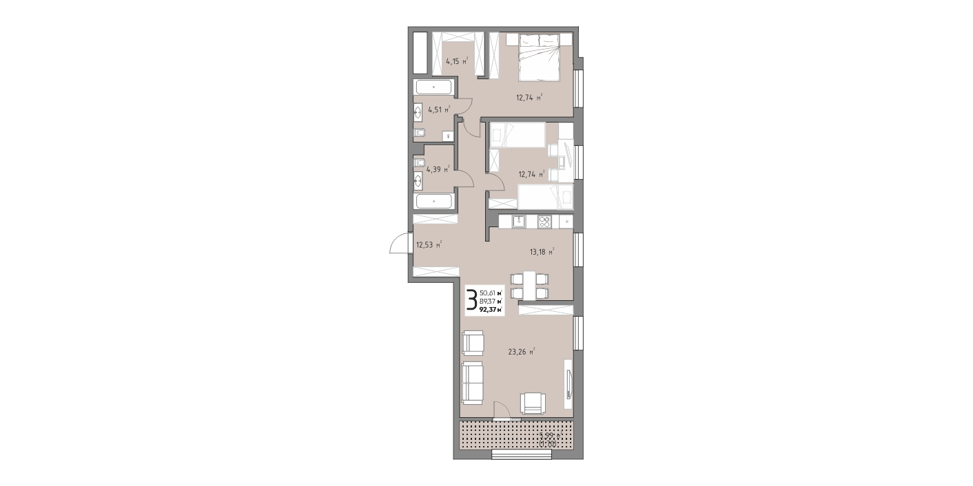 Квартира этаж 7, площадь 91.93 м2