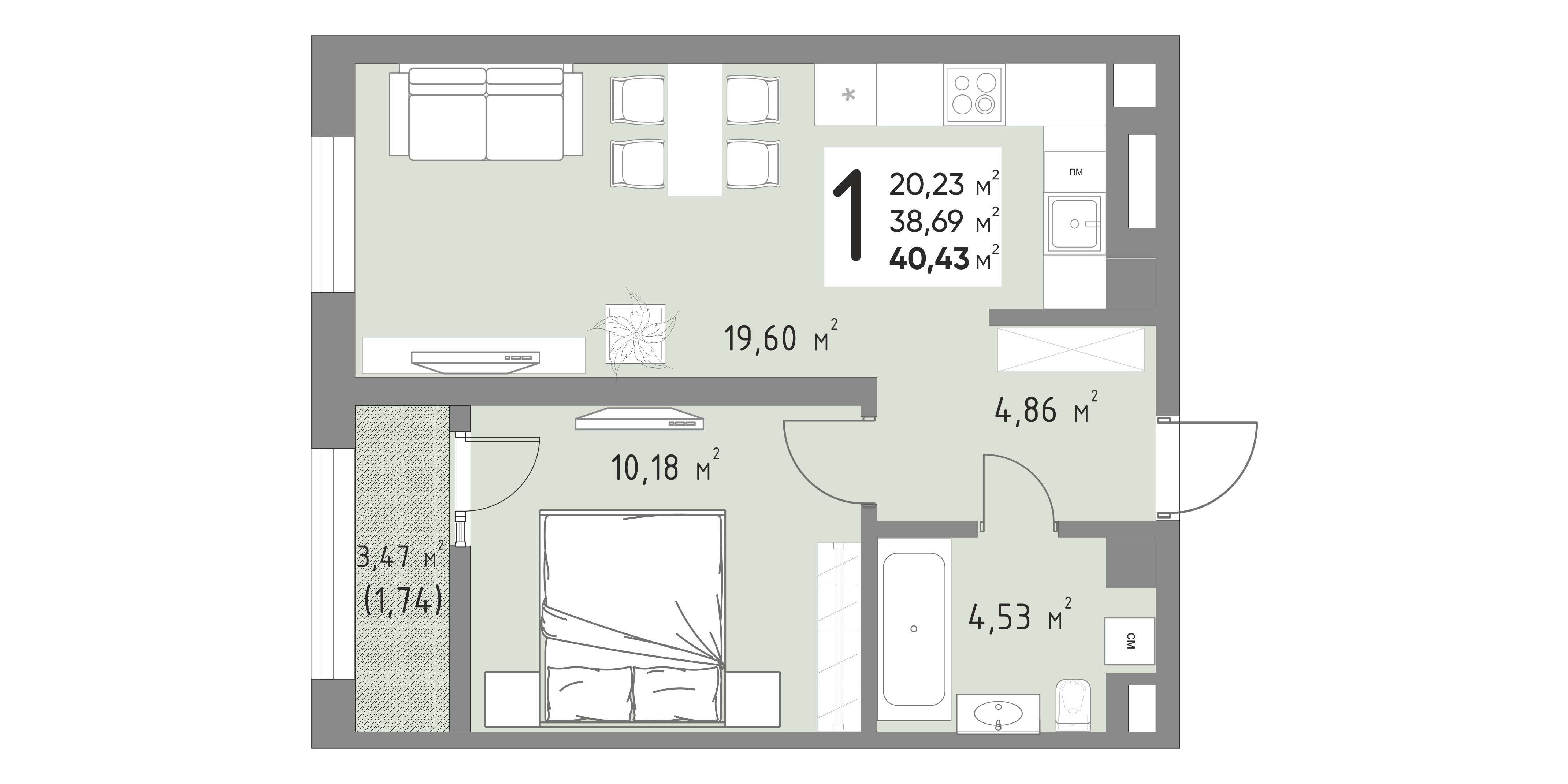 Общая площадь: 40.43м2