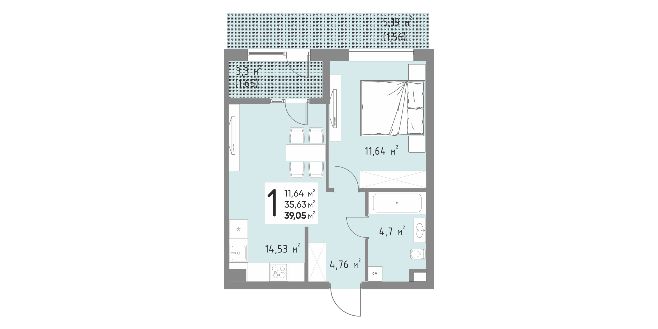 Общая площадь: 39.05м2