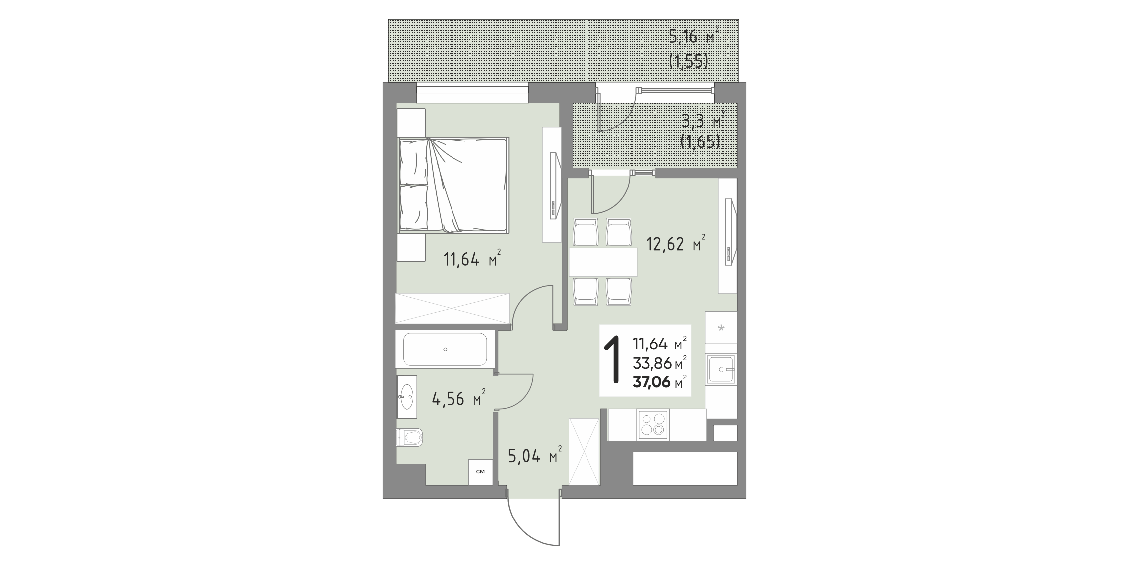 Квартира этаж 3, площадь 37.06 м2