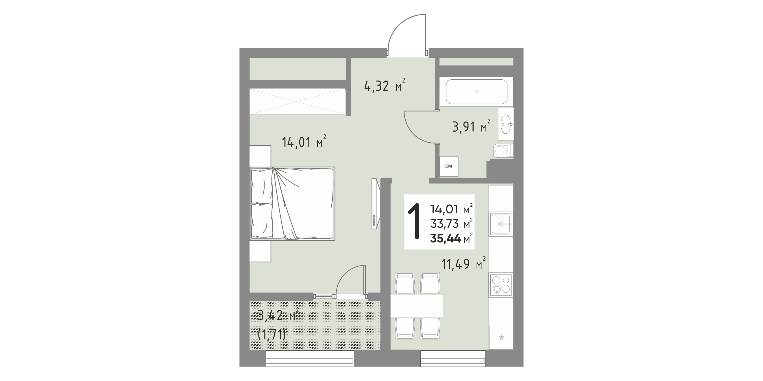 Общая площадь: 35.44м2