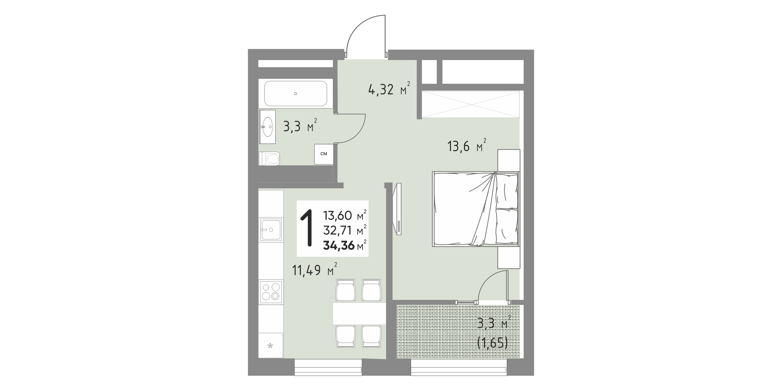 Общая площадь: 34.36м2