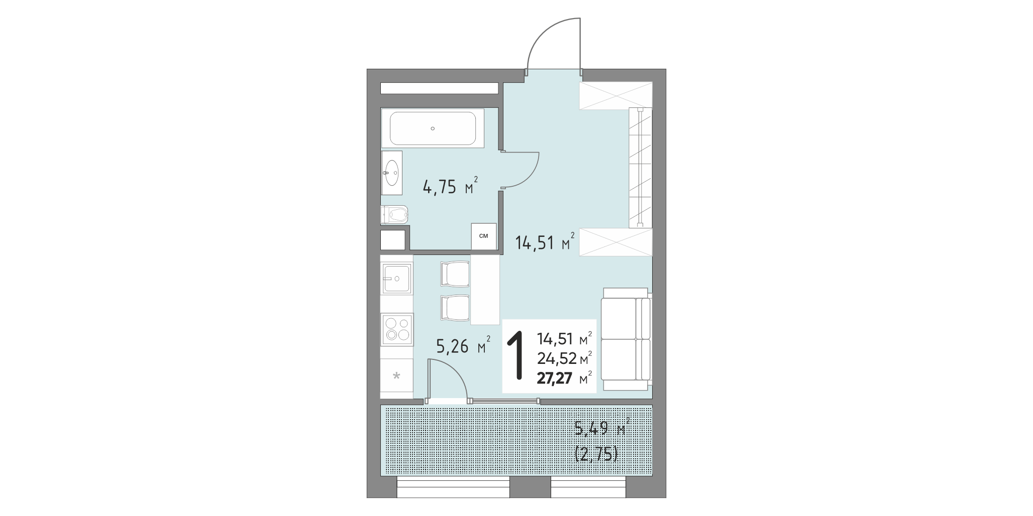 Общая площадь: 27.27м2