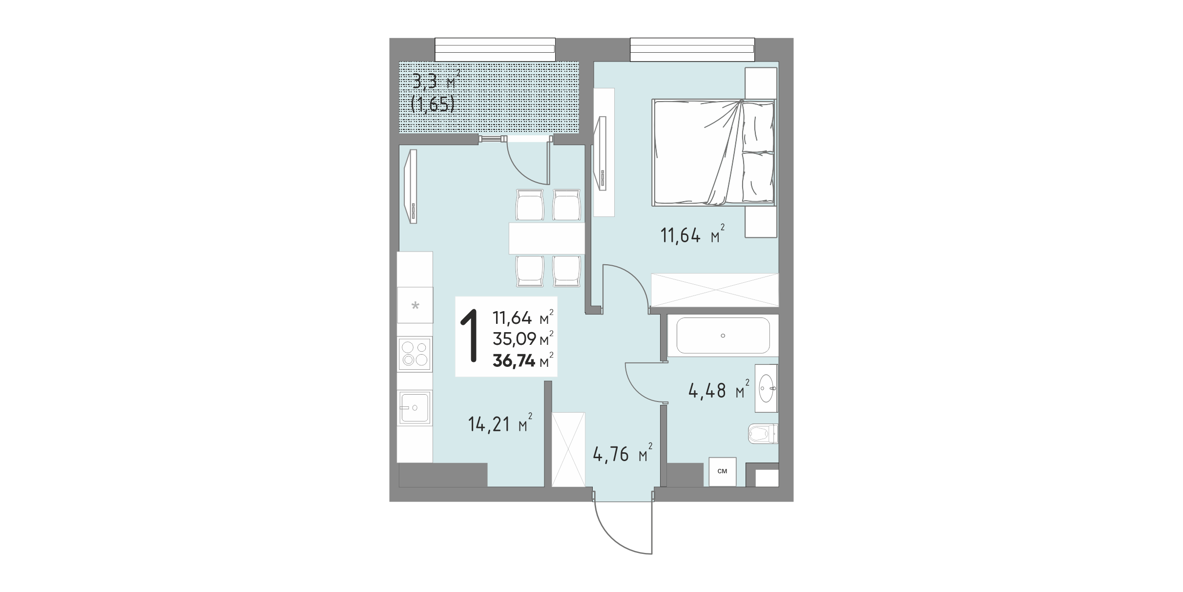 Общая площадь: 36.74м2