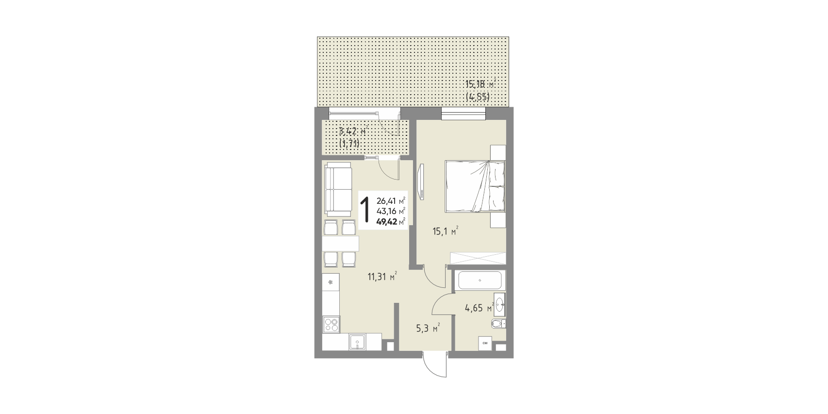 Общая площадь: 49.42м2