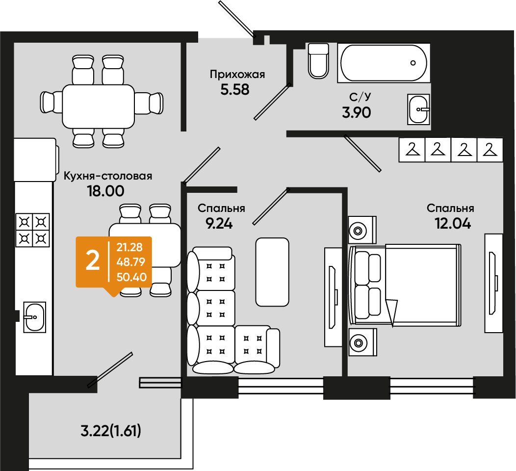 Квартира этаж 3, площадь 50.40 м2