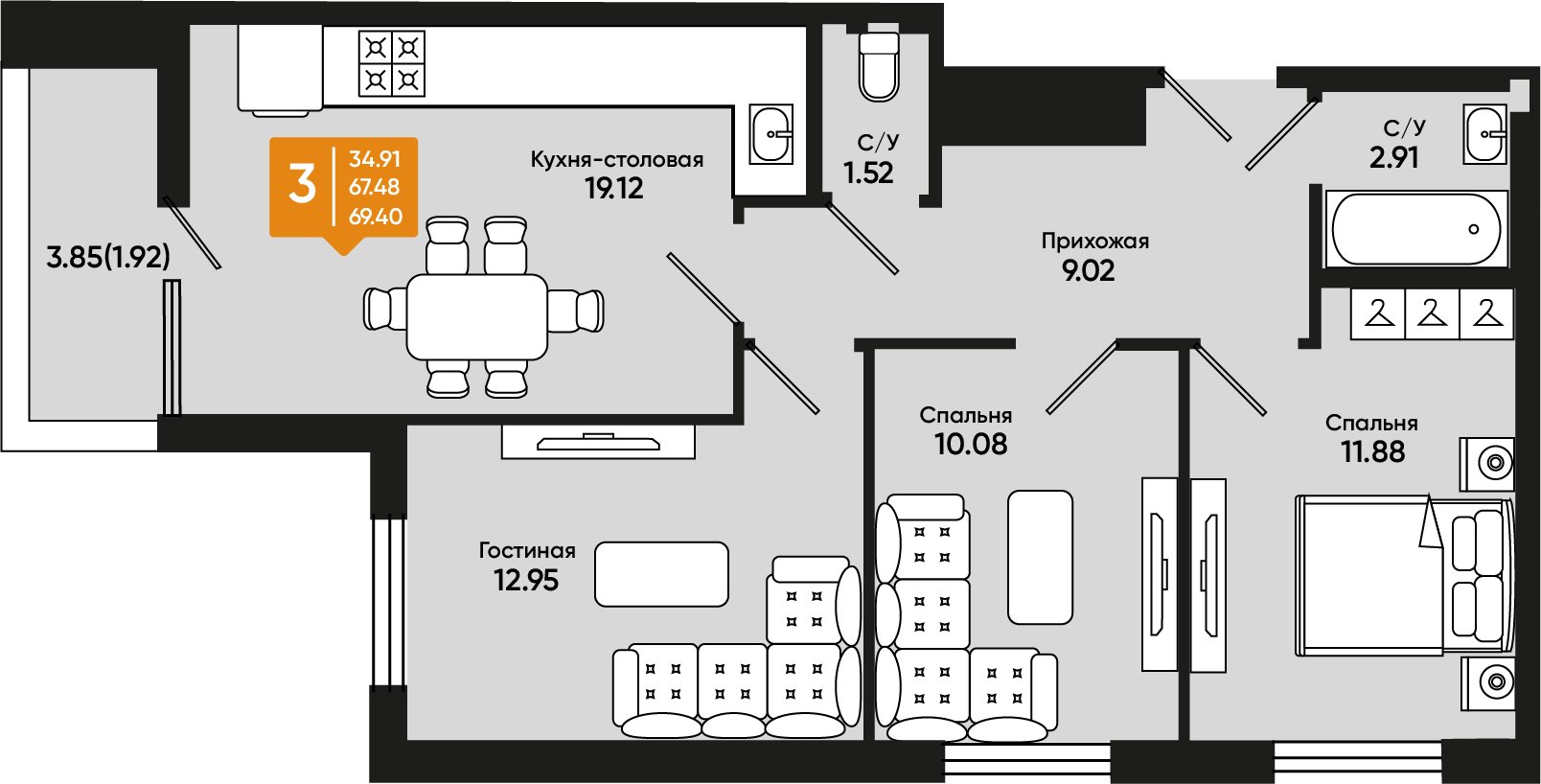 Квартира этаж 3, площадь 69.40 м2