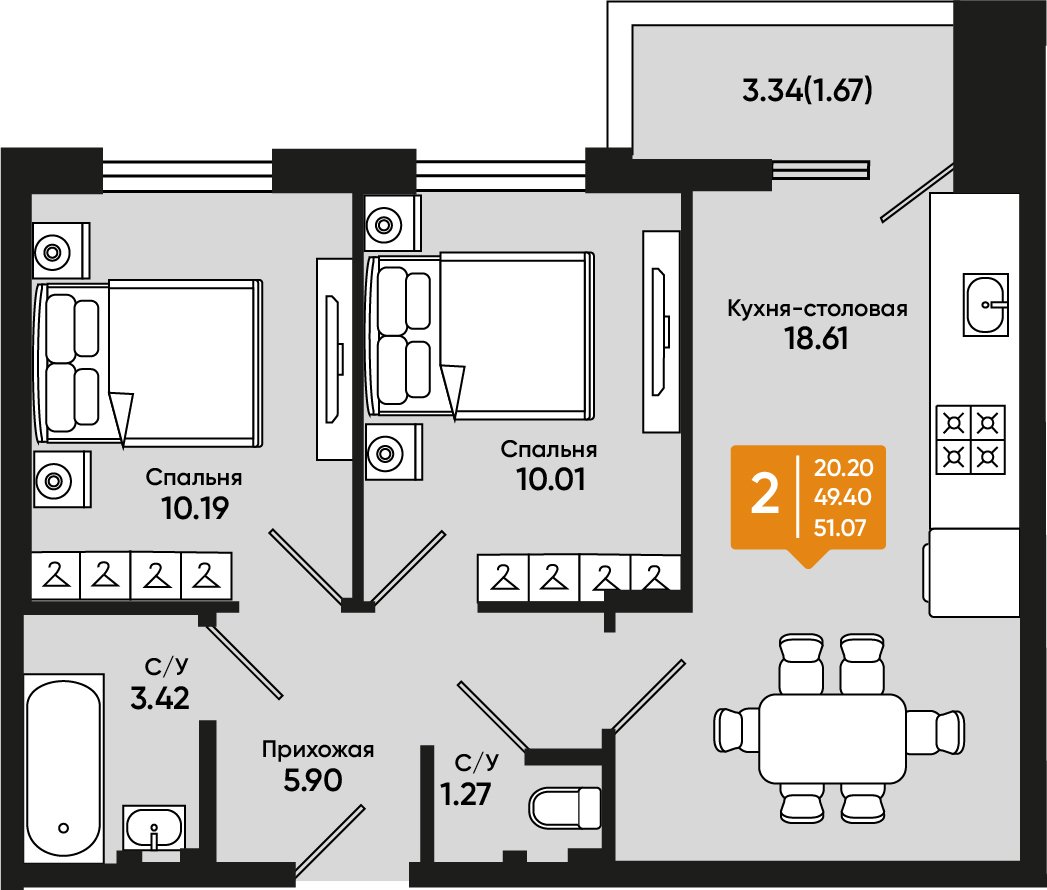 Общая площадь: 51.07м2