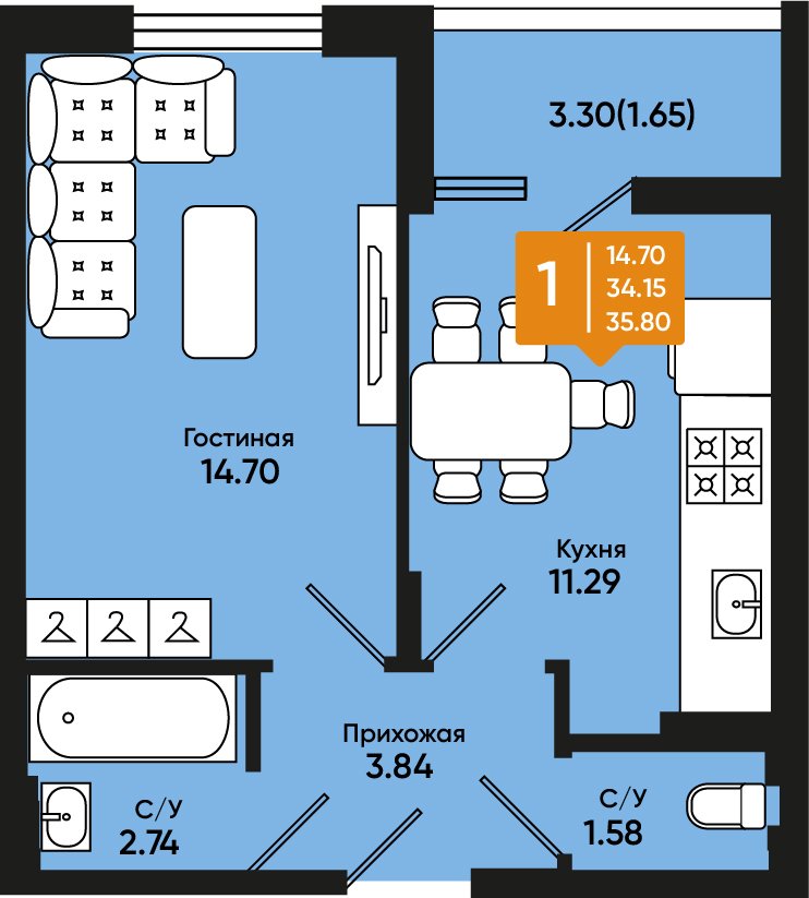 Общая площадь: 35.80м2