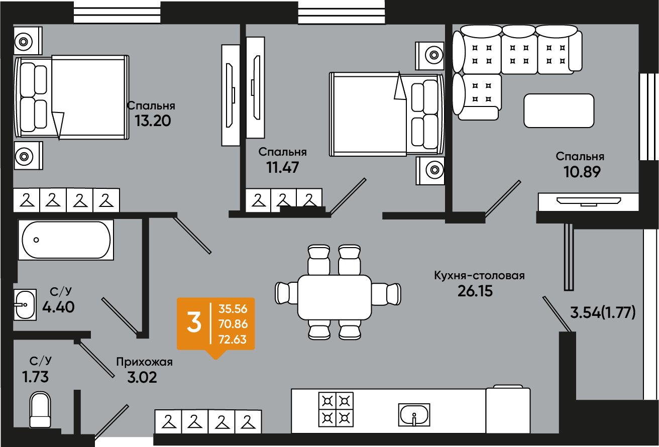 Общая площадь: 72.63м2