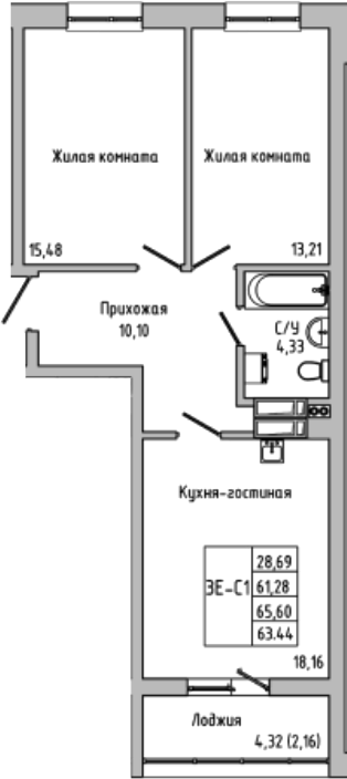 Общая площадь: 63.44м2