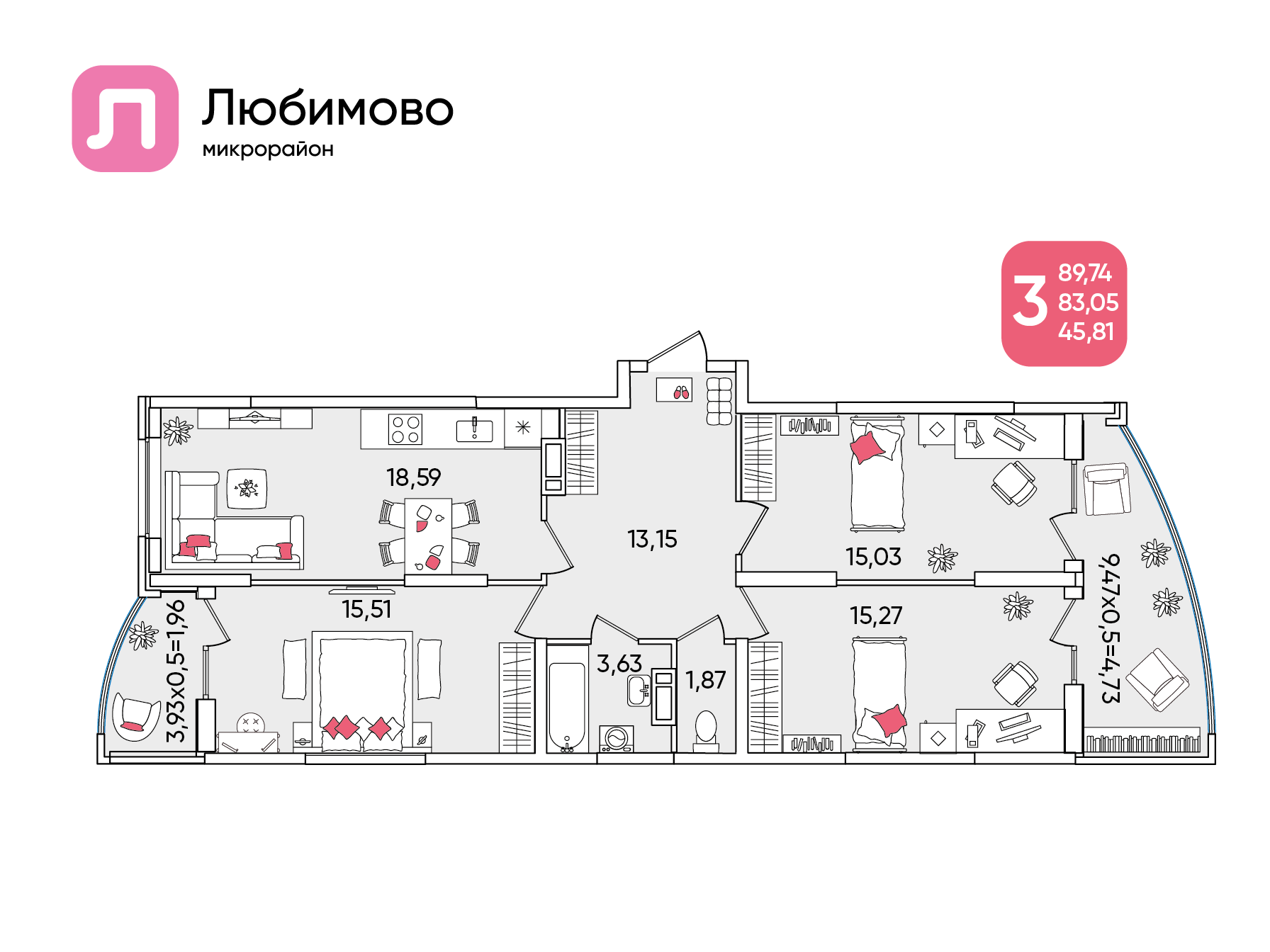 Общая площадь: 89.74м2