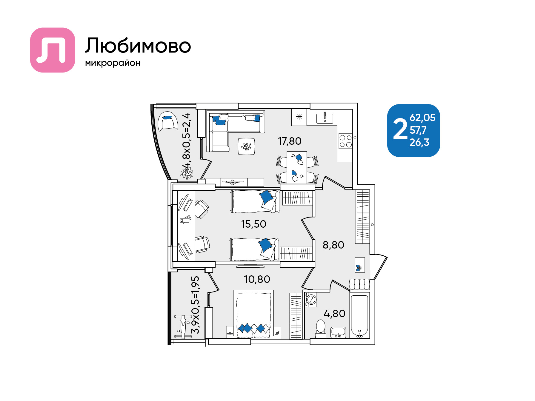 Общая площадь: 62.05м2