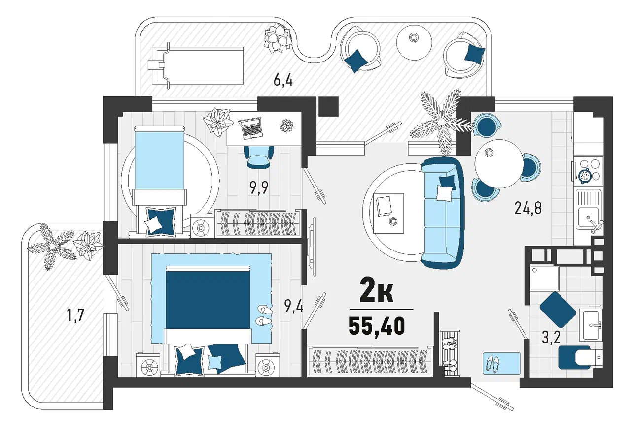 Общая площадь: 55.40м2