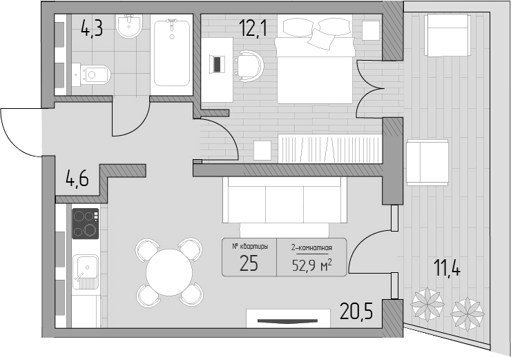 Квартира этаж 4, площадь 52.90 м2