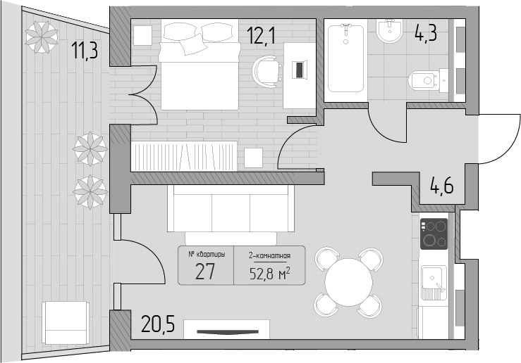 Квартира этаж 4, площадь 52.80 м2