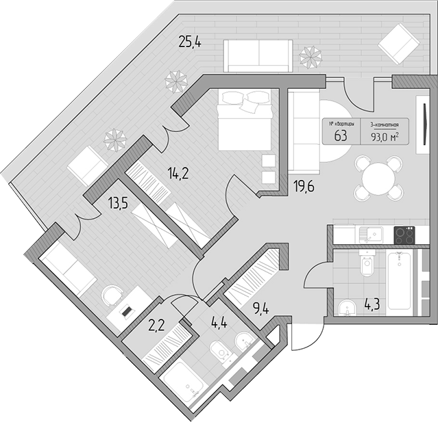 Квартира этаж 3, площадь 93.00 м2