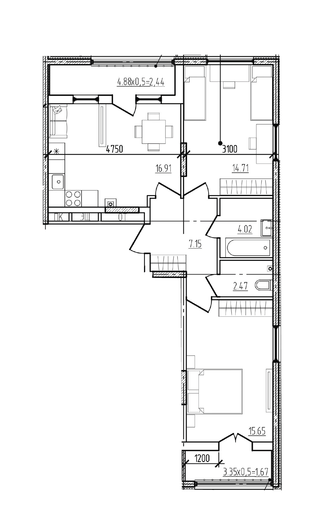 Общая площадь: 65.02м2