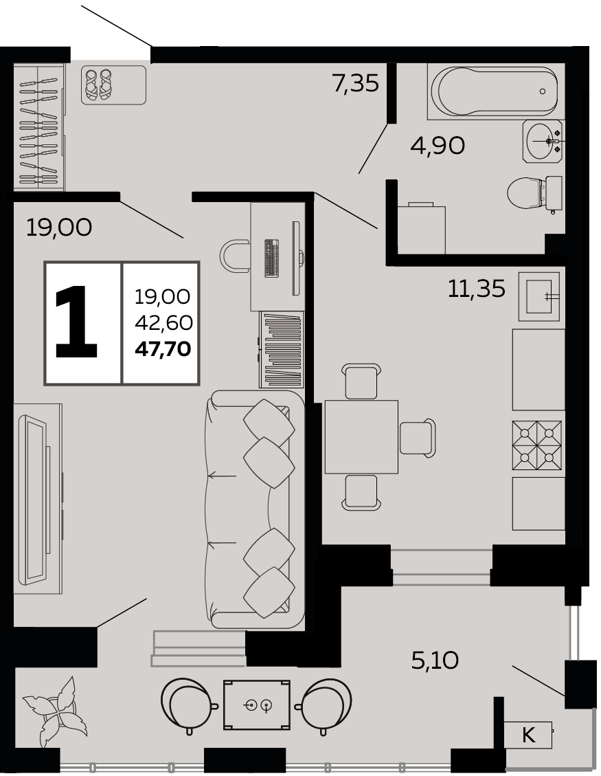 Квартира этаж 1, площадь 47.70 м2
