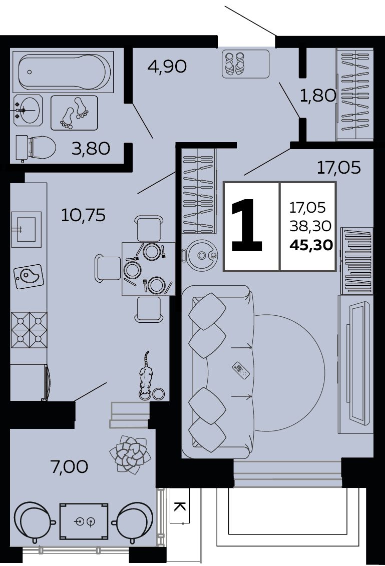 Квартира этаж 1, площадь 45.30 м2