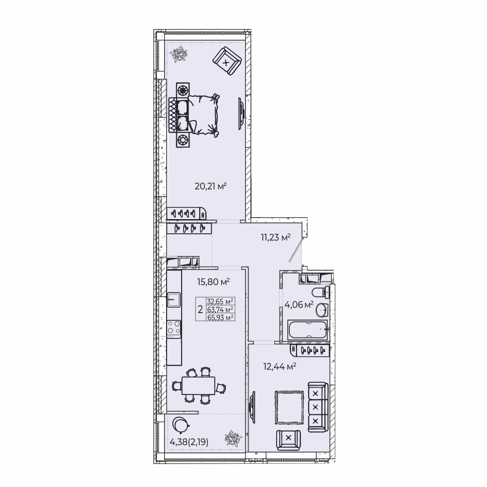 Квартира этаж 2, площадь 65.93 м2