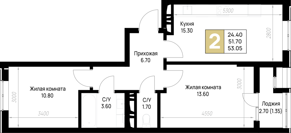 Общая площадь: 53.05м2