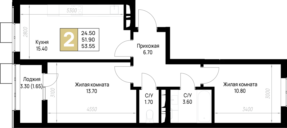 Общая площадь: 53.55м2