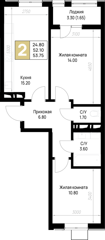 Общая площадь: 53.75м2